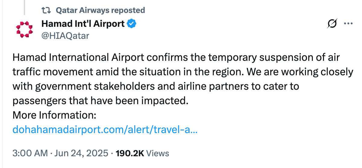 I guess the point I’m trying to land is this: Western airlines cancel flights when their insurers fear legal liability. Gulf carriers do so when their governments are braced for impact.