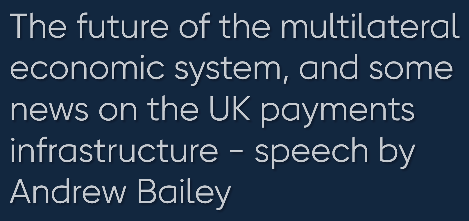 At this point, and having alienated my entire readership, I turn to Andrew Bailey’s address to the Financial and Professional Services Dinner, with the catchy title: The future of the multilateral economic system and some news on the UK payments infrastructure — also known as the Mansion House speech3.