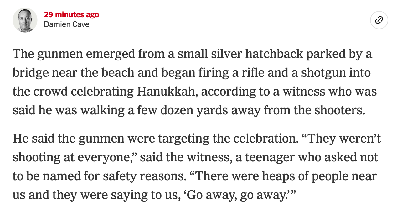 Yesterday afternoon local time, a father and son stormed Bondi, home not only to Australia’s most famous beach but to one of the nation’s largest Jewish communities, and murdered — at the time of writing — 15 people celebrating Hanukkah. See the witness statement given below to the New York Times. The assailants were encouraging others to flee. They only wanted to kill Jews.