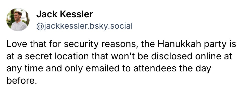 I don’t share much about Judaism or Jewish safety on that website, partly because the internet is — as a rule — a hostile place for Jews while Bluesky, like many left-wing spaces tend to — at best — treat antisemitism as a lesser crime. The manslaughter to proper racism’s murder, as it were.