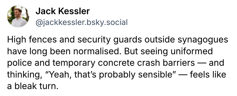 And so Jews are forced to erect fences. Limit access to controlled entrance points. Install CCTV cameras. Hire burly men to stand guard. Co-ordinate with police. Control online event details. We do this not only for places of worship, but for schools, hospitals and cultural centres — literally anywhere Jews may wish to gather and, you know, partake in civic life as Jews.