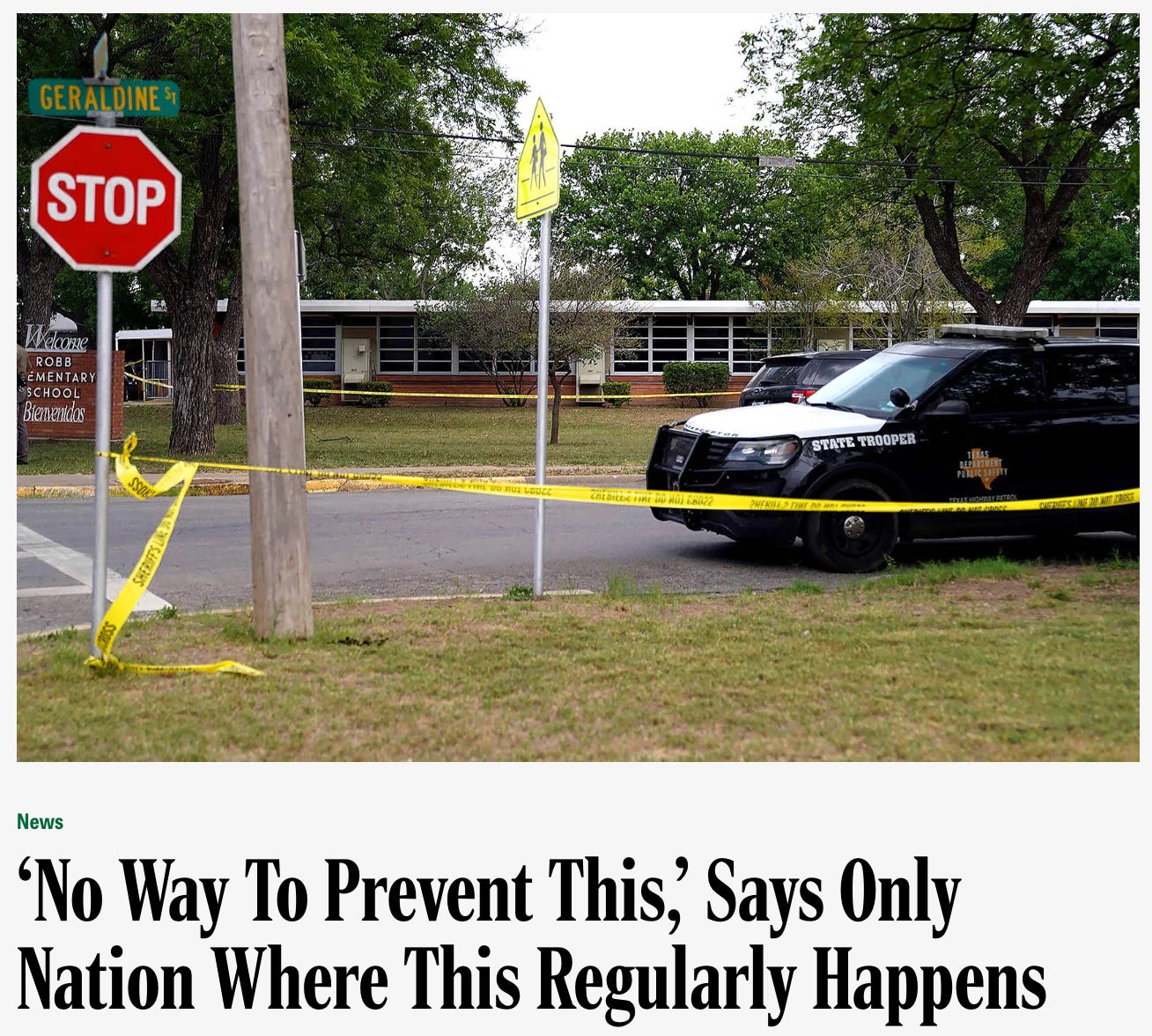 Almost 47,000 people died of gun-related injuries in the United States in 2023, according to the latest available figures from the Centers for Disease Control and Prevention. Such is the frequency of mass shootings that as of December 2024 the satirical newspaper, The Onion, has published the identical article and headline 38 times, quoting a fictional resident: “‘No Way To Prevent This,’ Says Only Nation Where This Regularly Happens”.