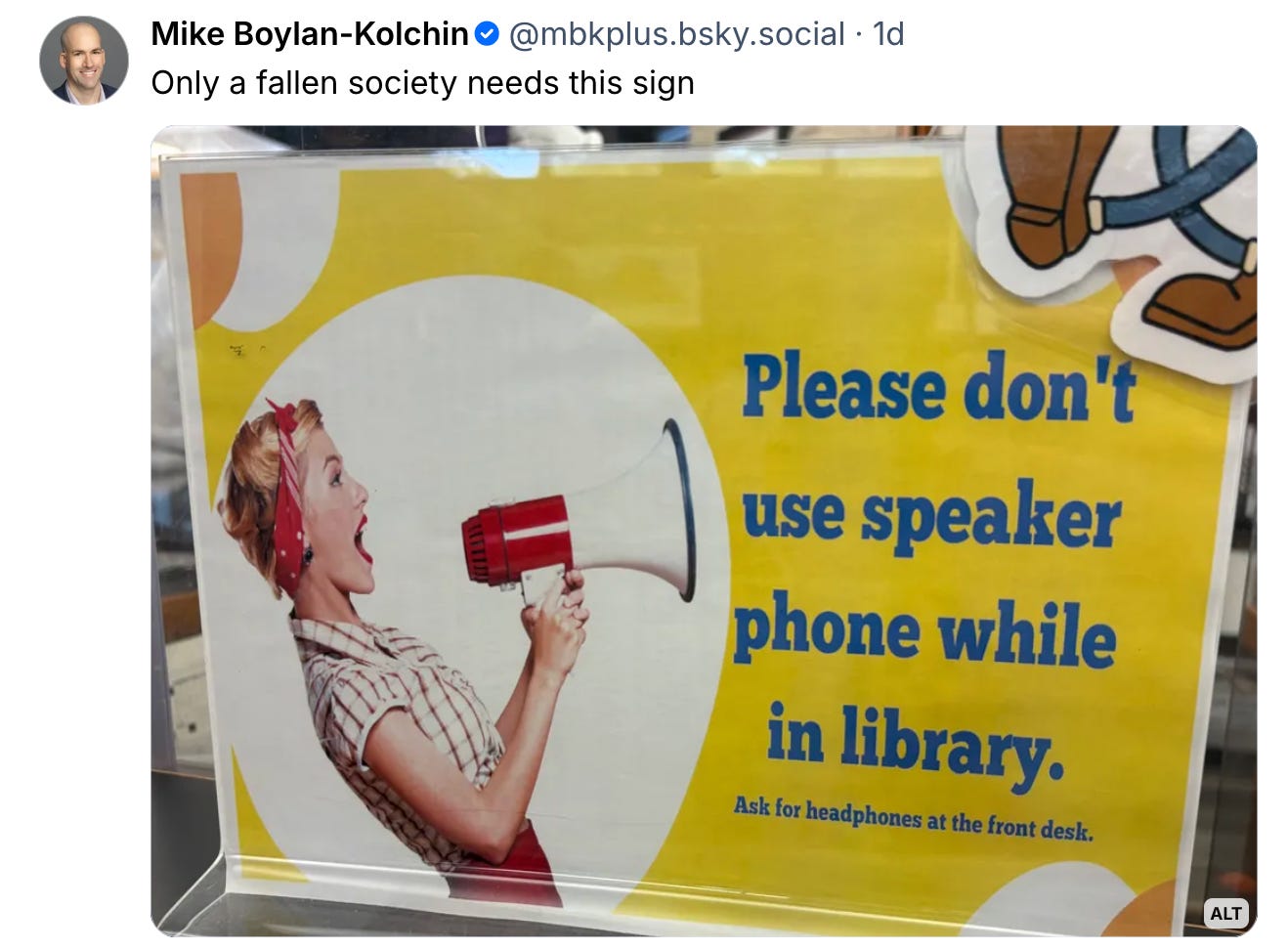 In a better world, noise pollution would be the moral panic of our age. Think strangers holding phone calls on the 16.52 to Guildford for the benefit of the entire carriage. This post comes to mind: