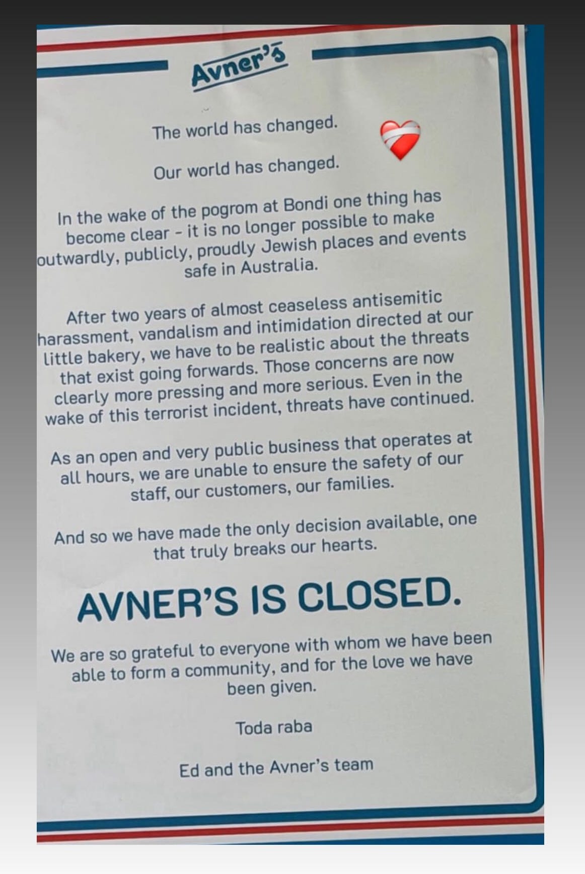 Next, I walked past a synagogue and couldn’t help but notice the police car stationed out in front. Just for reassurance, you know? Finally, I checked my phone and saw the news that Avner’s, a nearby Jewish bakery in multicultural and fashionable Surry Hills, had abruptly announced it was shutting down, after “two years of almost ceaseless antisemitic harassment, vandalism and intimidation.”