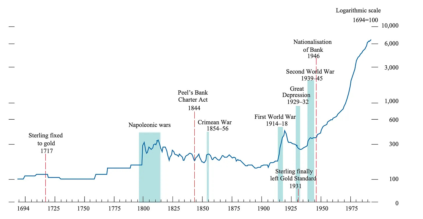 And the Golden Globe for Best Supporting Statistic goes to… Inflation. Specifically, how prices in Britain rose by roughly 750% in the 25 years to 1992 — more than in the previous 250 years. Following the collapse of the Bretton Woods system in 1971, when US President Richard Nixon unilaterally ended the convertibility of the dollar to gold, the UK lost what former Bank of England Governor Mark Carney (whatever happened to him?) called its “nominal anchor”.