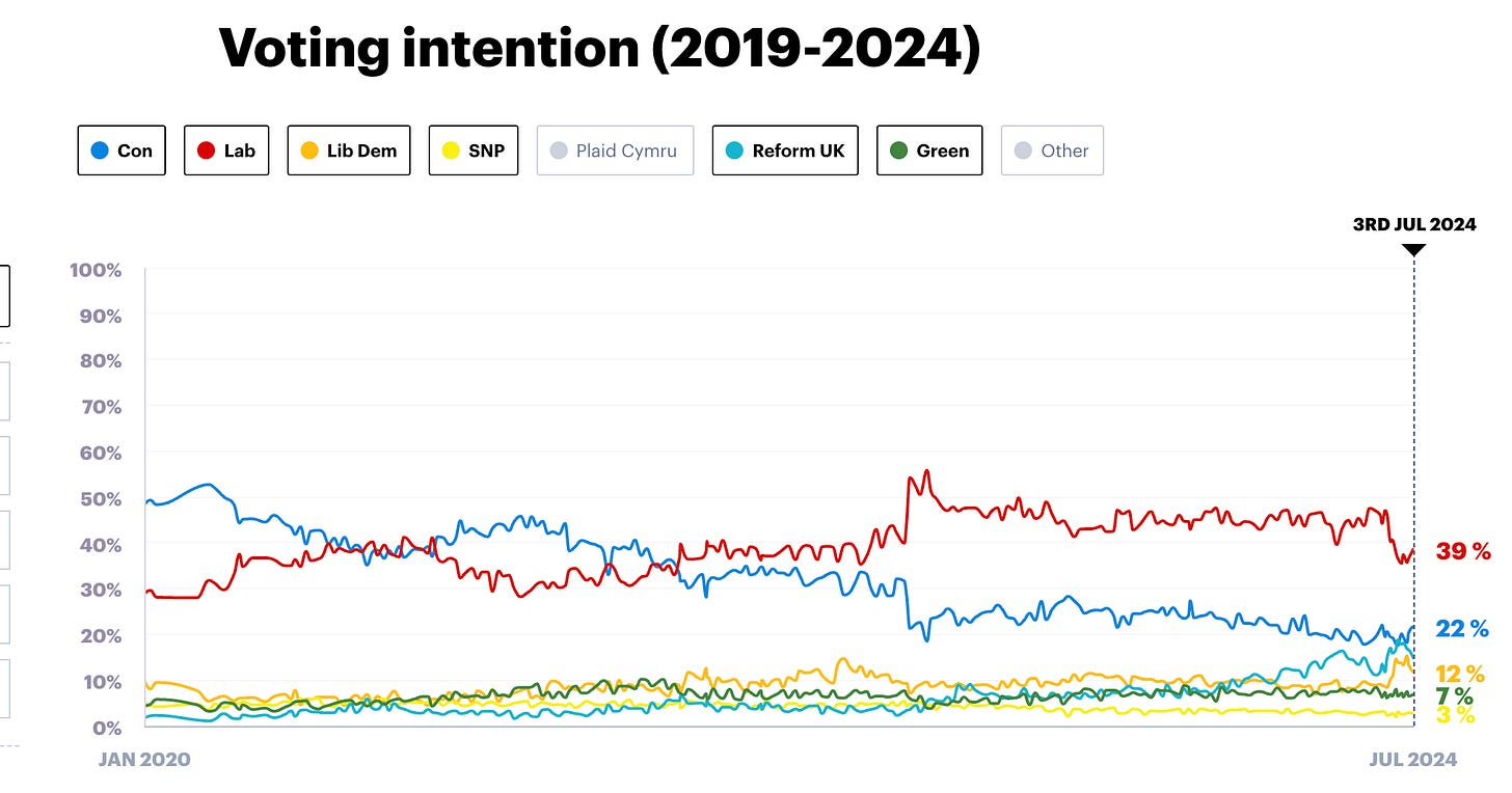 Labour had enjoyed double-digit poll leads for almost two years, sparked by Liz Truss’ disastrous ‘mini-Budget’. Her successor, Rishi Sunak, was deeply unpopular. Such was the Tories’ acceptance of inevitable defeat that during the short campaign, their main attack line was largely warning against a so-called “super-majority”.