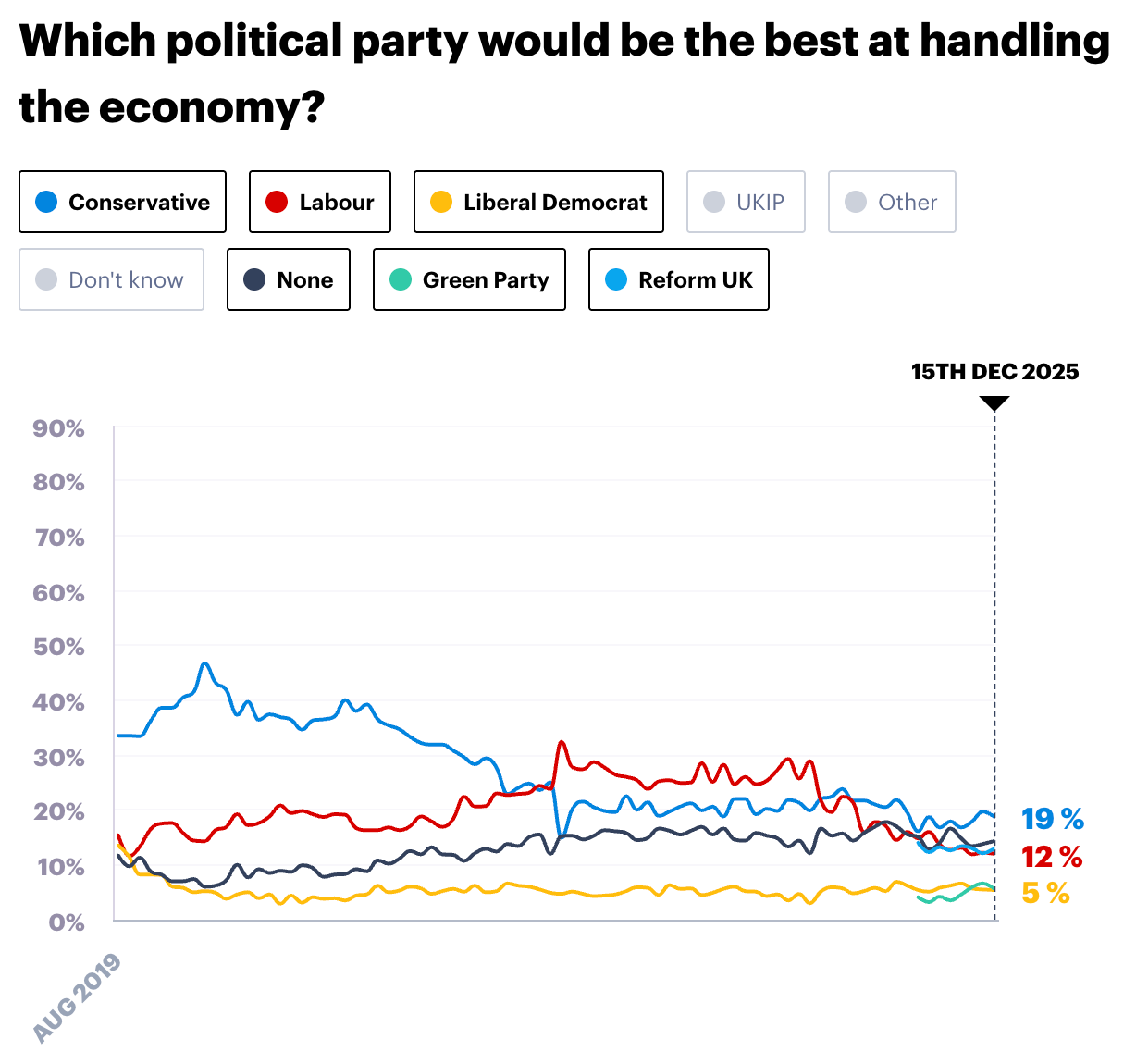 This represents a clear dividing line — and a rare attempt by the Conservatives to play to their strengths on the economy while presenting themselves as a mainstream centre-right party. As you can see from the below chart, the Tories enjoy a narrow lead on the issue.