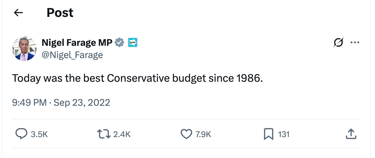 It is open to debate just how economically left-wing a Reform government would be in practice. Responding to Nigel Farage's speech last month, the Institute for Government’s Helen Miller described it as “very large tax cuts to be paid for with very large spending cuts”, with the latter very much unspecified. This is scarcely a surprise, given that Farage was one of the loudest cheerleaders for Liz Truss’s disastrous ‘mini-Budget’, which he labelled at the time, "the best Conservative budget since 1986".