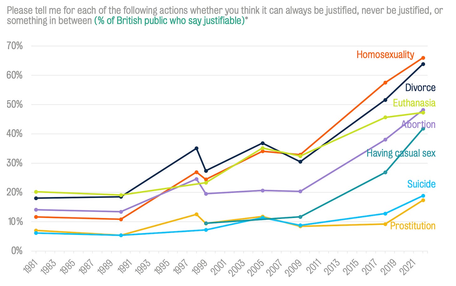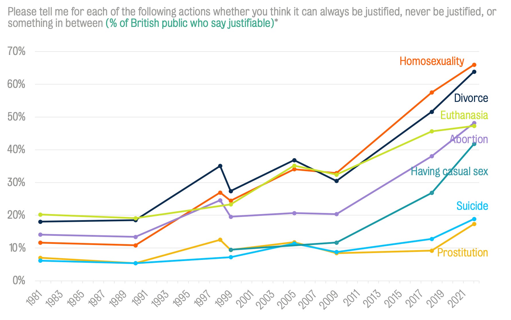 This is history, of course. Yet since then, the market for social conservatism has narrowed sharply. Data from the British Attitudes Survey finds that the UK ranks as among the most socially liberal countries in the world, characterised by marked shifts in views on a whole slew of issues. For example, two-thirds of Britons now say homosexuality is justifiable, up from 12% in 1981. As for divorce, support has risen from 18% to 64%1.