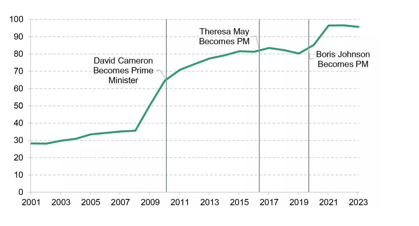The June 2010 Budget set out the coalition government’s deficit reduction plan, with an emphasis on spending cuts rather than tax increases at a ratio of 80:20. By 2015, the balance had tilted even further toward cuts. This was, of course, a political choice, one Rachel Reeves is now grappling with.