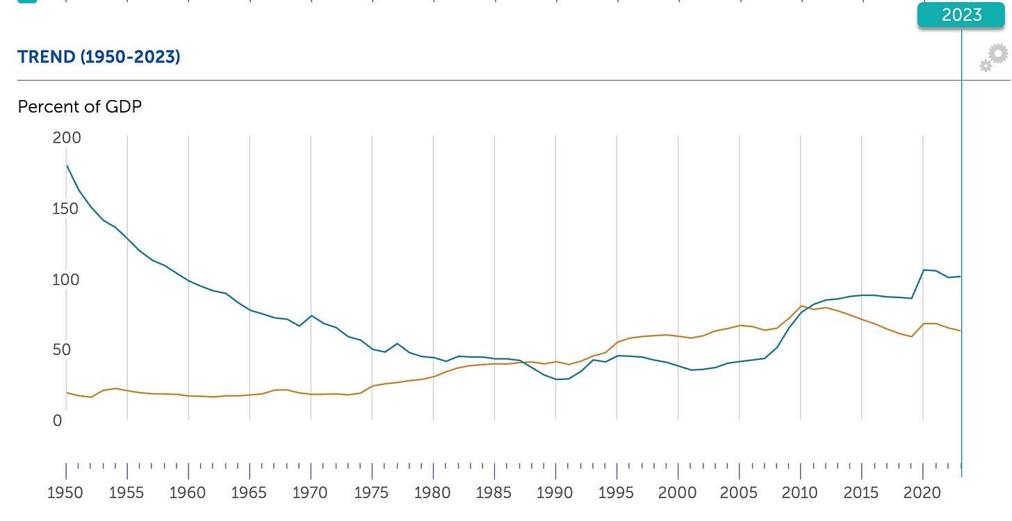 A quick Google search (as long as you ignore the AI garbage at the top) seems to explain the discrepancy. Germany has a debt-to-GDP ratio of around 63%, compared with Britain’s 95.5%. Yet, this is where a little knowledge is a dangerous thing.