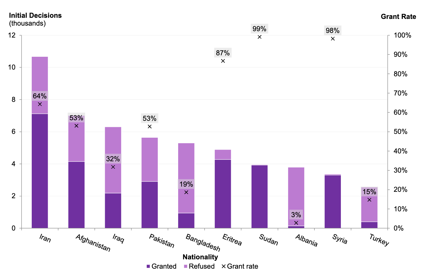Analysis by The Migration Observatory finds that 93% of small boat arrivals from 2018 to March 2024 claimed asylum, and of those who had received an initial decision, around three-quarters were successful. Indeed, the grant rate for migrants arriving in small boats has been higher than the average rate for asylum applications generally. This is largely because many of the most common nationalities for those on small boats, such as Afghan, Syrian and Eritrean, have some of the highest grant rates.