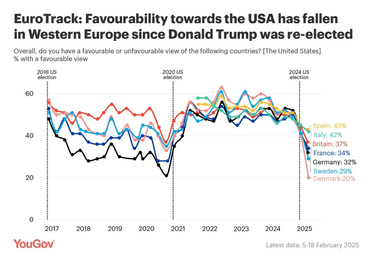 Traditional US allies are naturally horrified. As a result of recent events, favourability towards the US has plunged in Britain, a trend that has been mirrored across Western Europe, as polling by YouGov makes clear.