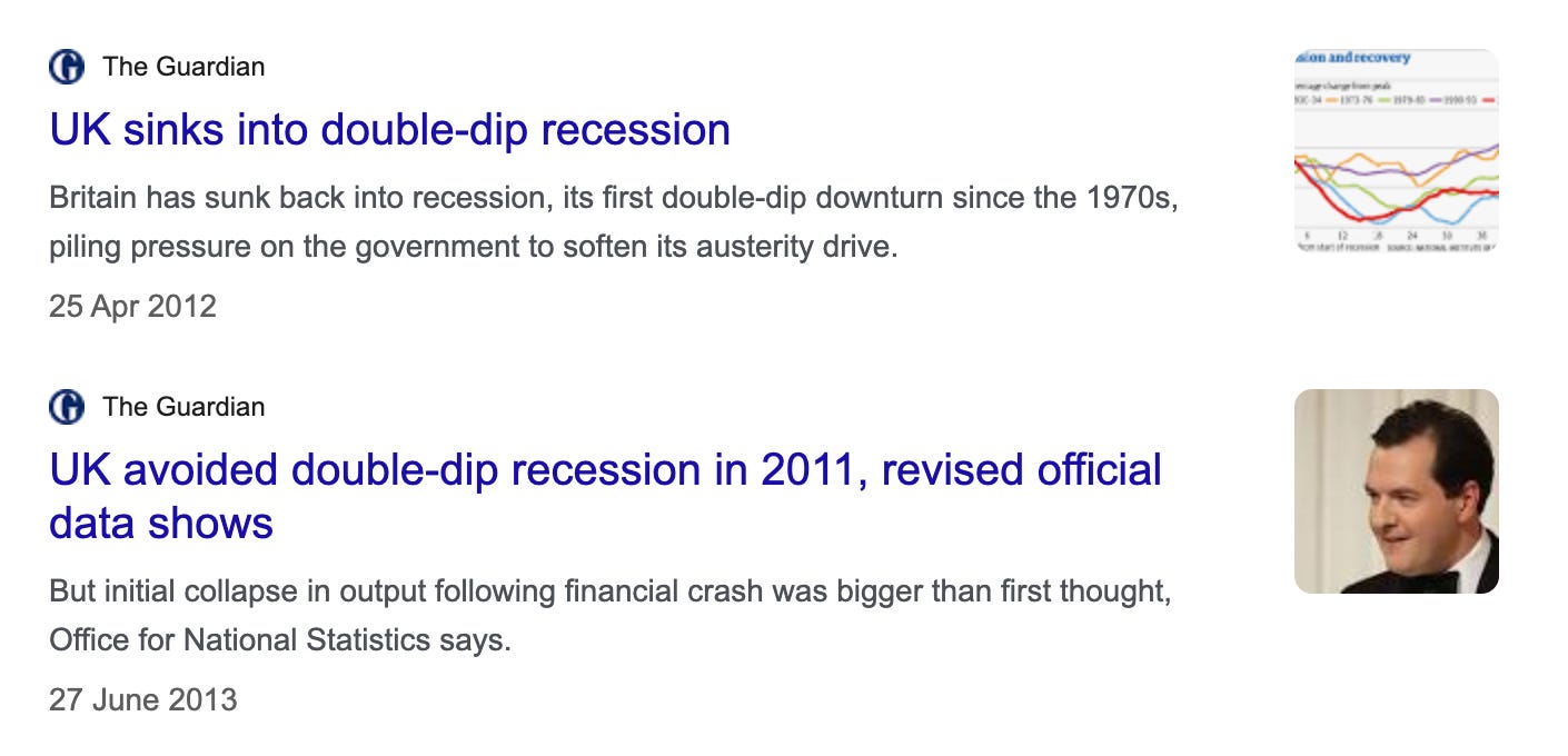 Do you remember the double-dip recession of 2011-12? As the nation was gearing up for the Olympic Games, the economy shrank by 0.2% in the first quarter of the year, according to the Office for National Statistics (ONS). Coming fresh off a contraction of 0.3% in the final three months of 2011, that added up to a recession. Cue calamitous headlines and shadow chancellor Ed Balls1 doing the flatlining gesture that so riled David Cameron at PMQs.