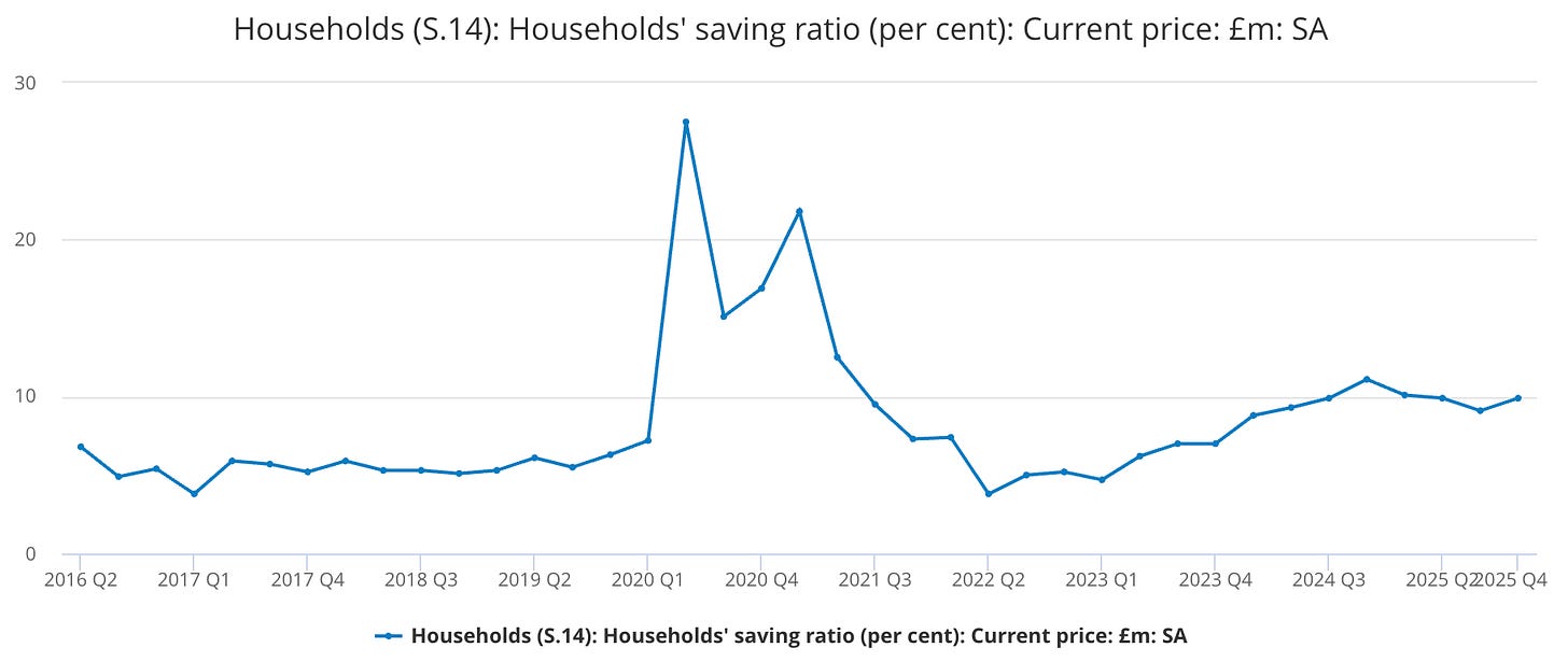 Moving on to the demand side, there were numerous other inflationary pressures. Consumer demand back then was strong — during the pandemic, the UK savings ratio hit a thirty-year high. Hardly surprising given that people weren’t allowed to leave their homes. This spare cash, in concert with those supply chain problems, was inherently inflationary.