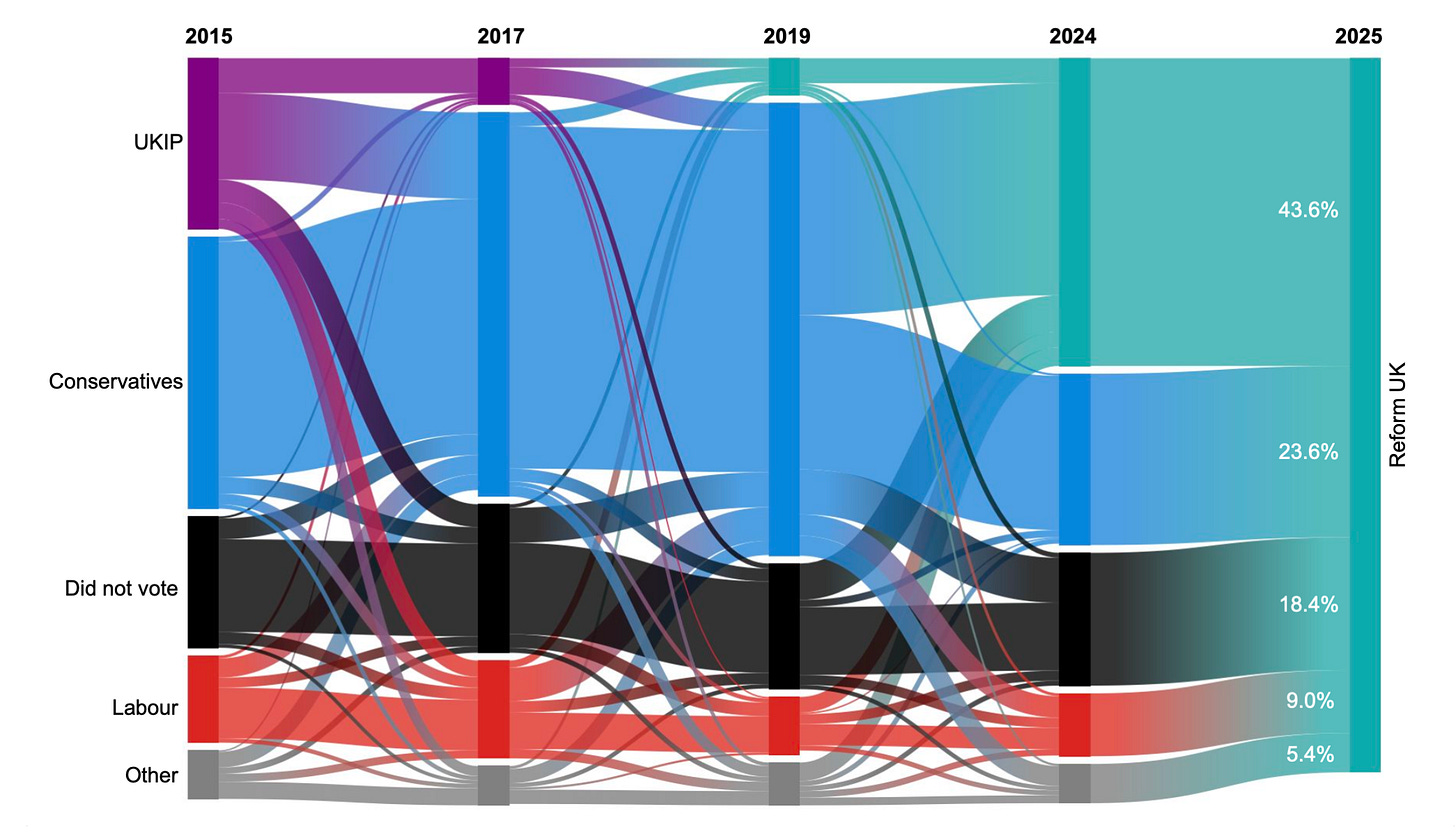 It’s understandable that Reform’s polling should rattle Labour strategists, but the data suggests the real risk lies elsewhere. Green and Miori highlight two key reasons. First, that post-2016, even in ‘Leave’ areas, Labour voters are as likely to be ‘Remainers’ as those in Remain-leaning constituencies. And second, few Reform supporters have even voted Labour at any point this century. Instead, they conclude: “Reform’s gains have long originated from the Conservative split on the right, and are continuing to do so today.”