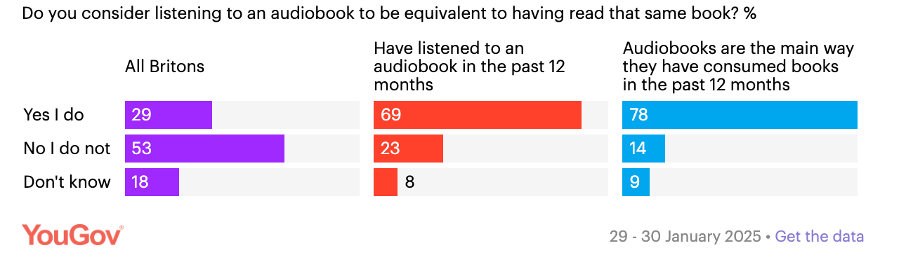 As it happens, just 29% of Britons say that listening to an audiobook is the same as having physically read that book. But here is where lived experience comes in. Amongst those who have listened to an audiobook in the past 12 months, that figure jumps to 69%, and 78% amongst those for whom audiobooks are the main way they consume books.