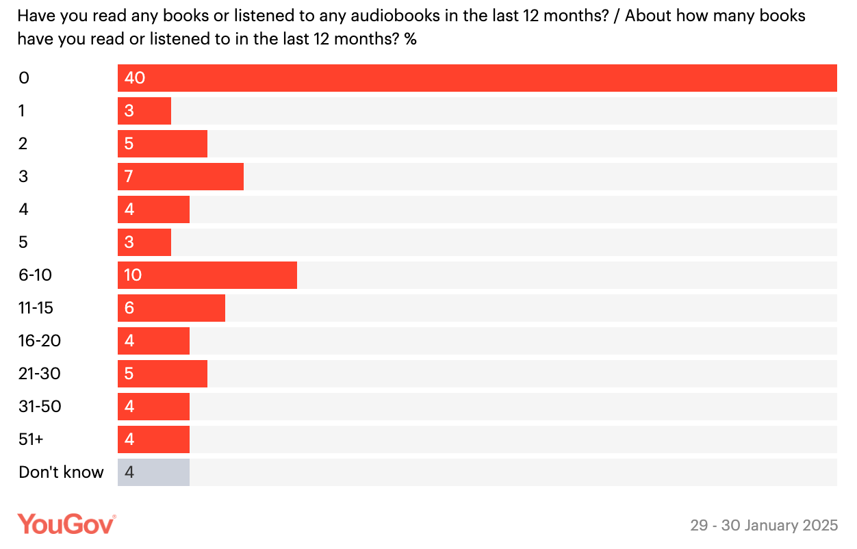 I was reminded of it again as I stumbled across a neat bit of recent polling from YouGov. The headline figure is stark enough: 40% of Britons haven’t read a single book in the last 12 months.