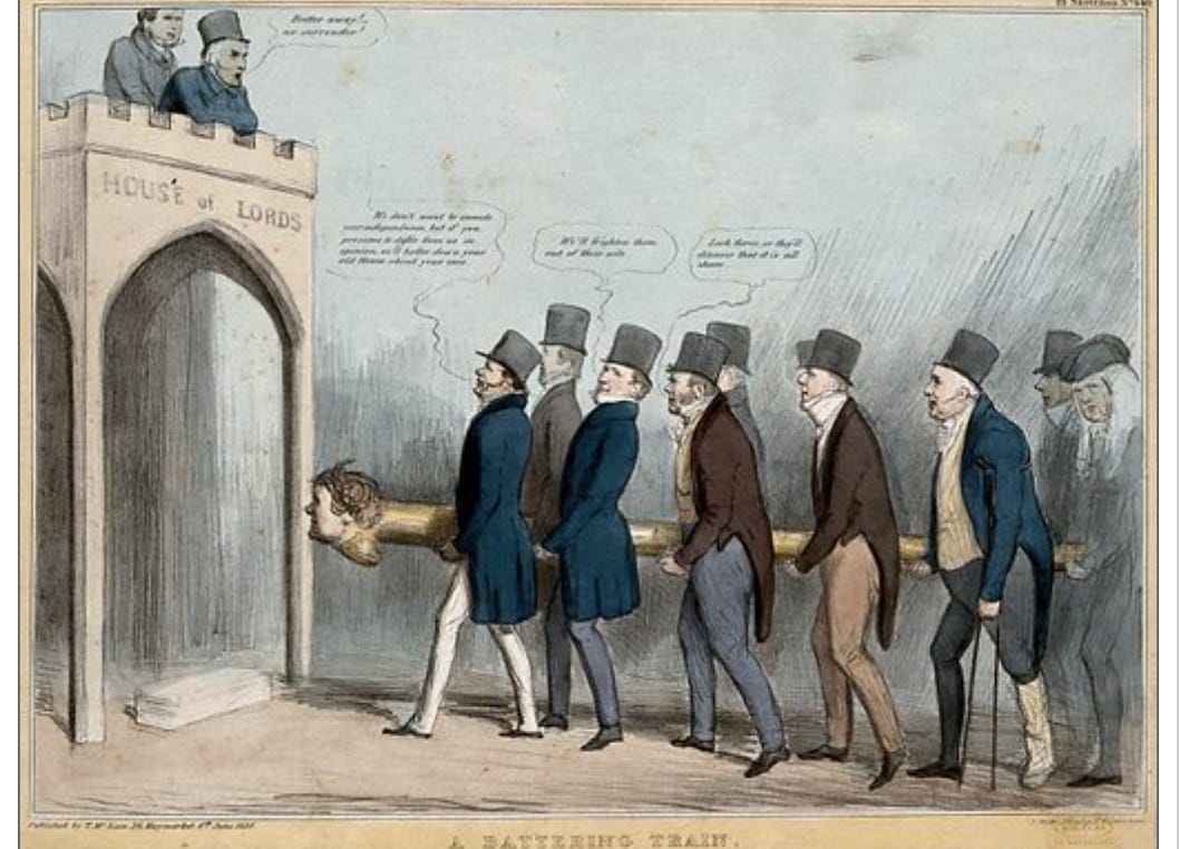 After the Tory government was ousted in late 1830, Grey, a Whig, became prime minister and undertook his promise to carry out parliamentary reform. On being twice rebuffed by the Lords1, Grey managed to persuade a reluctant King William IV of his plan to create new pro-reform peers to force his legislation through. At which point, the Lords relented and the Representation of the People Act — better known as the Great Reform Act — passed in June 1832.