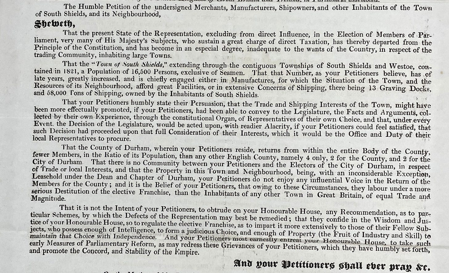 The people of South Shields were not happy — and it is not difficult to see why. The town wanted to be able to elect its own Member of Parliament, but this was 1830, and such things were not permissible.