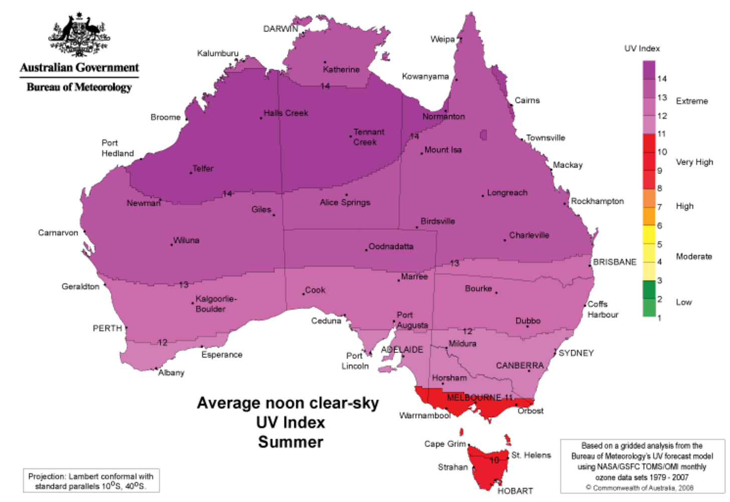 During summer, almost the entire country receives an “extreme” UV rating. And while it can definitely get hot in the Northern Hemisphere — the highest recorded temperature of 56°C took place in Death Valley, California in 1913 — UV levels tend not to climb as high, or for as long as they do Down Under. Little wonder that Australia is considered the skin cancer capital of the world.