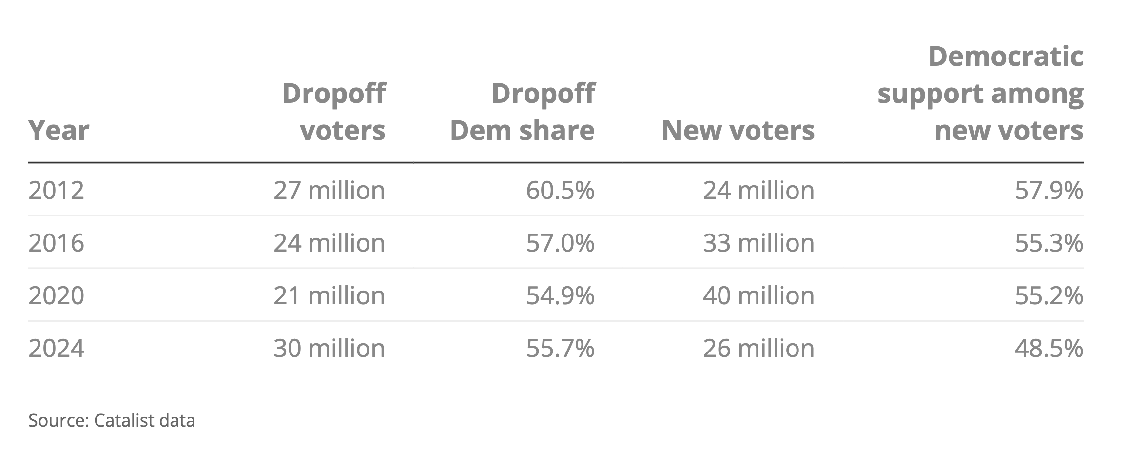 Catalist, a Democratic-leaning data firm, has just released its review into the 2024 presidential election. Its analysis is considered gold standard, in the words of the Cook Political Report, because “it integrates data like vote history, Census data and Catalist’s own polling and modeling”. This provides both a wider and more granular view of who joined the electorate and who left it. You can find the whole thing here.